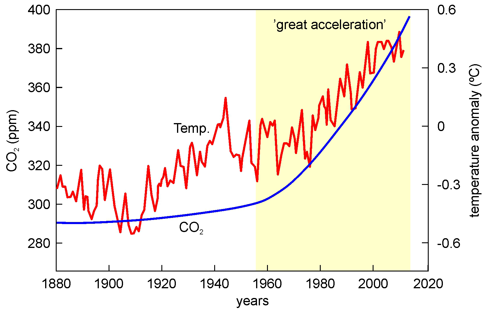 We might expect some future extreme disruption of relative planetary stability such as another asteroid hit, but that does not matter anymore, for we have created our own cataclysmic disruption of Holocene tranquility. The “great acceleration” of global economic growth is reflected in both CO2 emissions and average global temperature. We have moved too far already down a dark path of self-destruction while holding on to a delusional fantasy of omnipotence over an Earth System that will no longer tolerate our hubris.